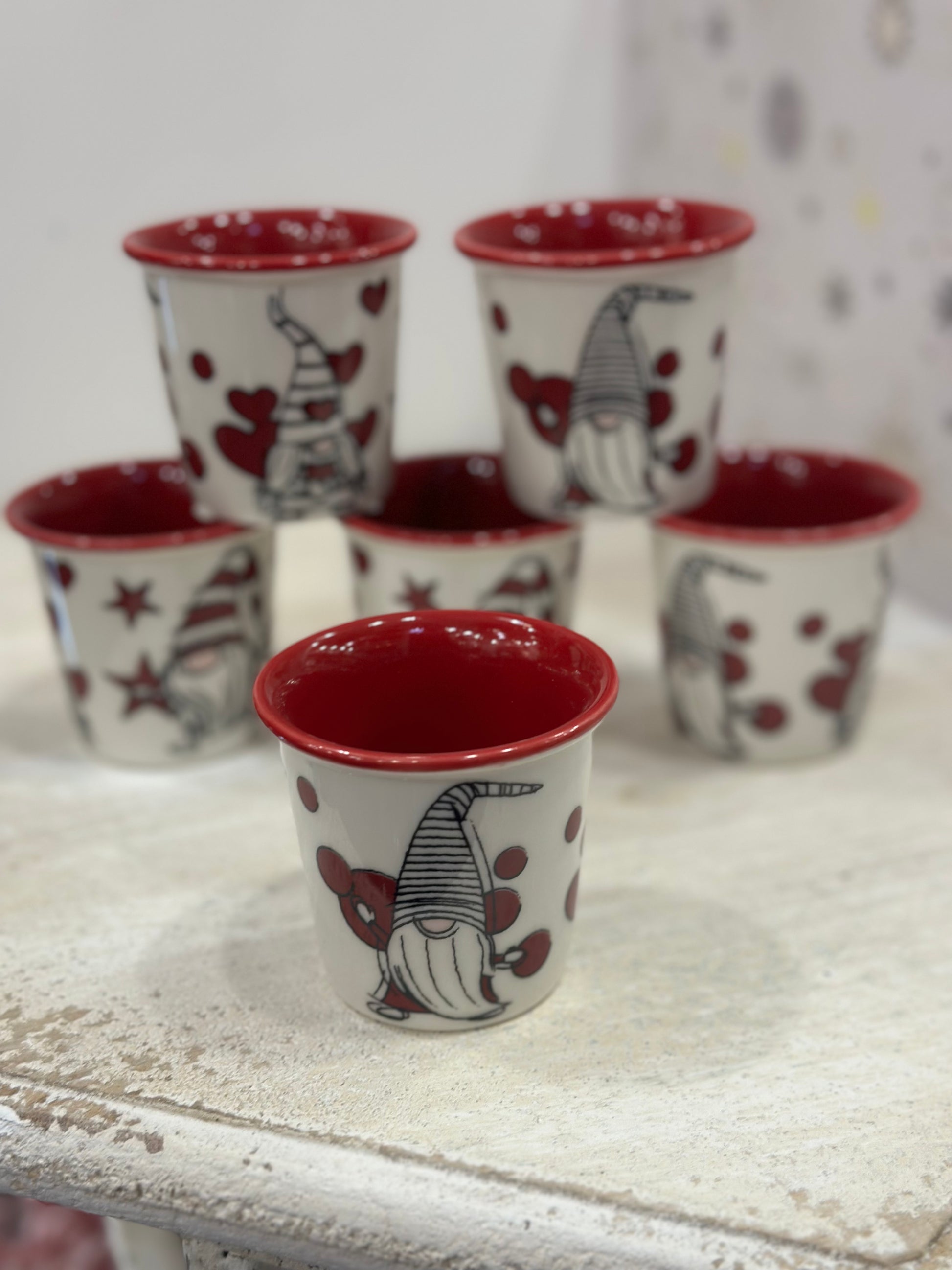 Gnome Sweet Home è la collezione di bicchierini da caffè natalizi in porcellana decorata con gnomi stilizzati e cuoricini.