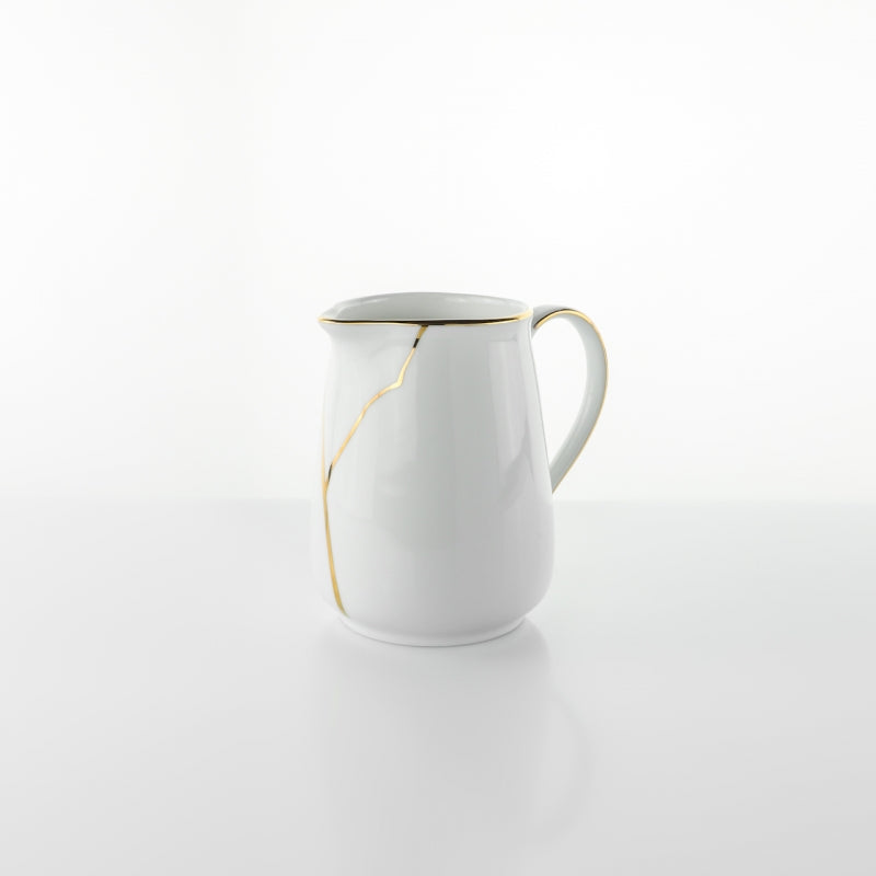 Il decoro è in vero oro 12 kt applicato a mano su smalto satinato bianco. La forma dell'articolo è unica e accuratamente irregolare.