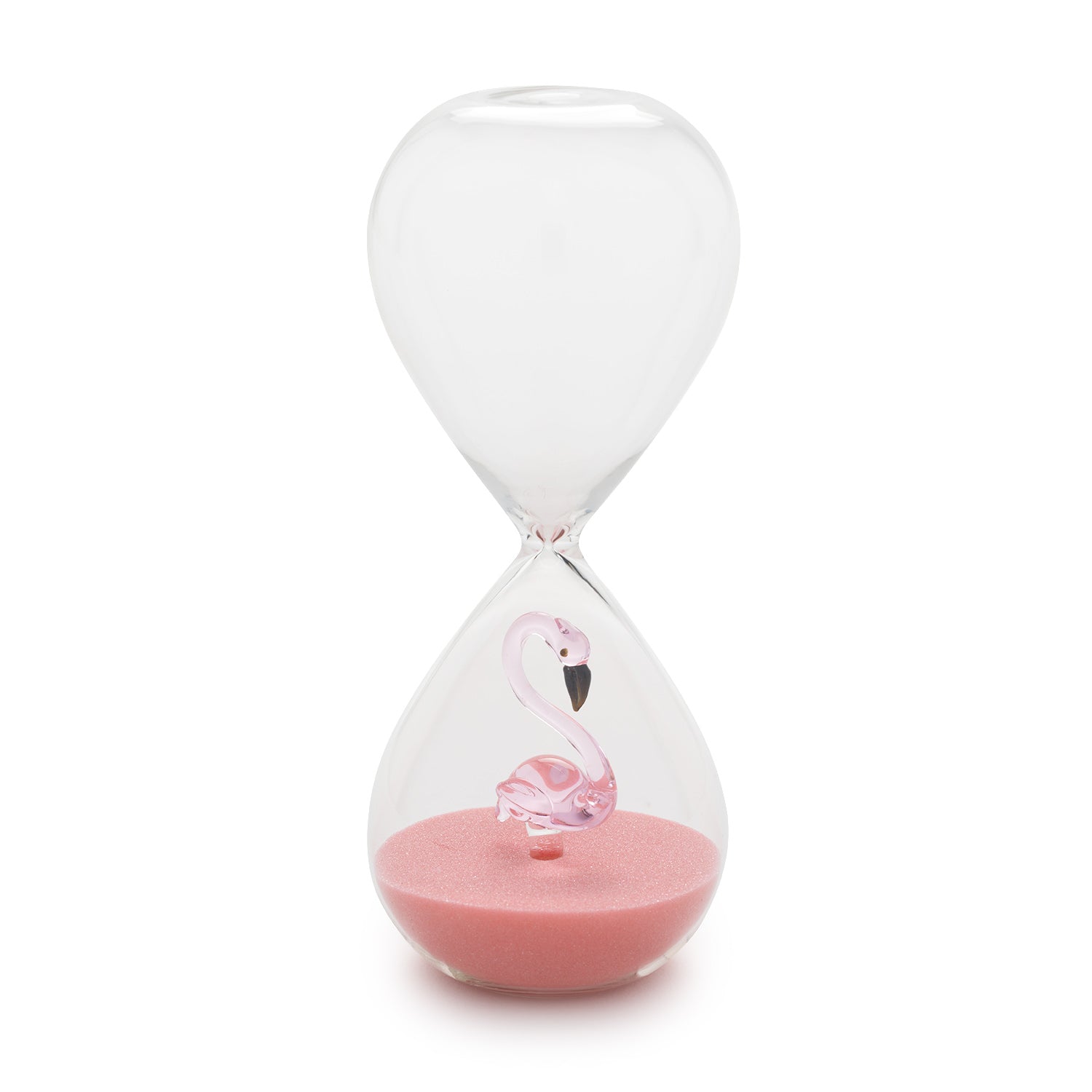 Clessidra in vetro borosilicato e decorazione fenicottero interno c/sabbia rosa. Durata 15 minuti