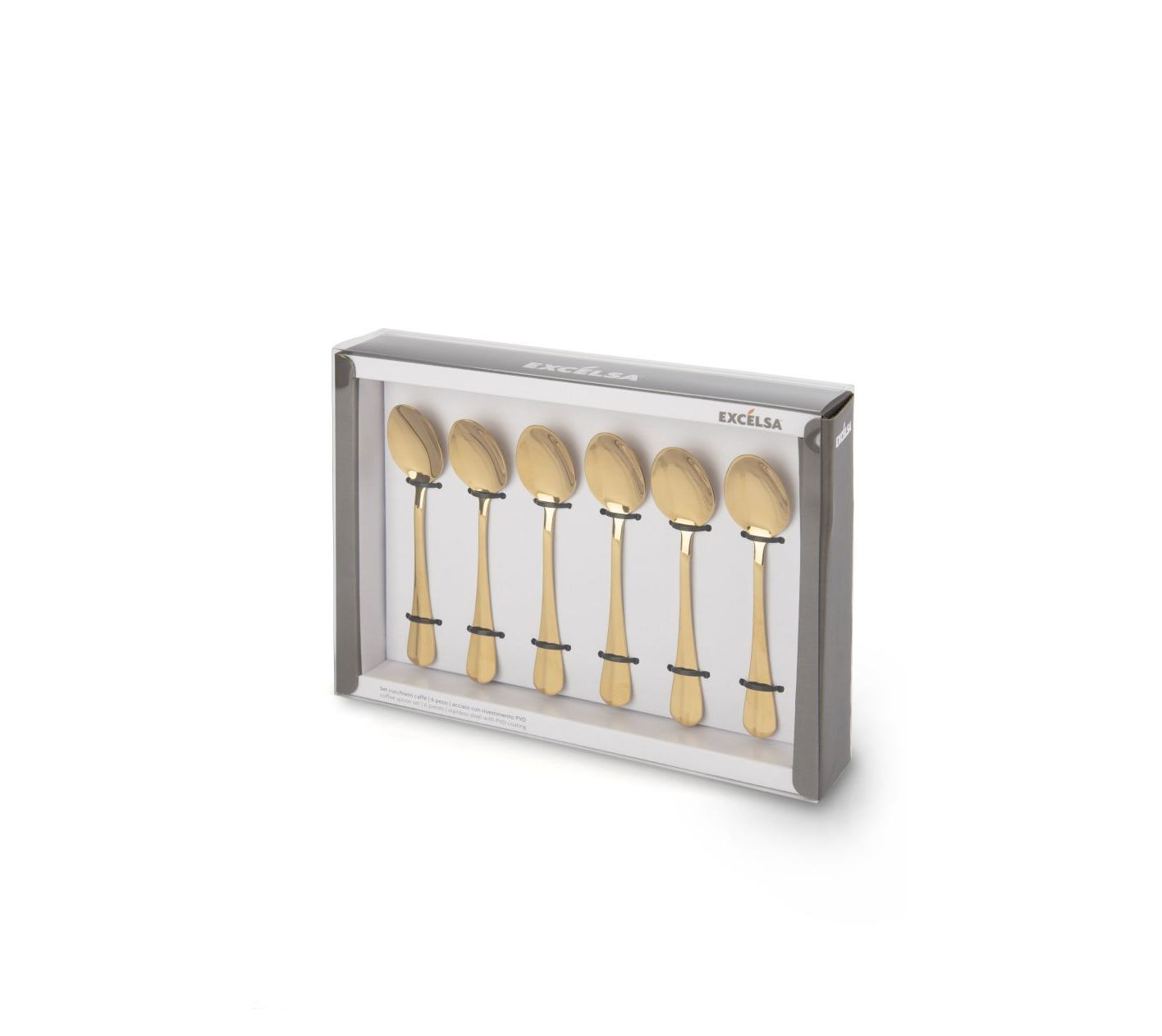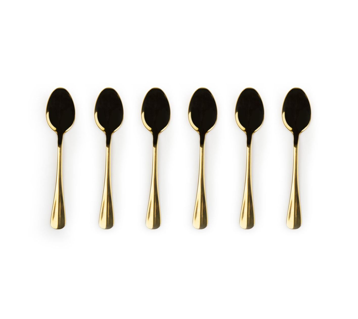 Set di 6 cucchiaini finitura color oro che renderanno la tua tavola più elegante e formale. La confezione include 6 cucchiaini moka.