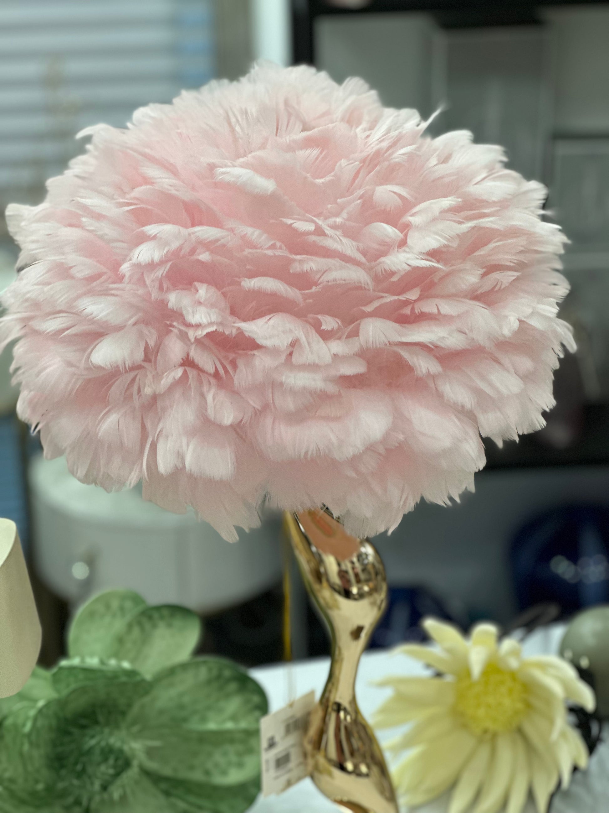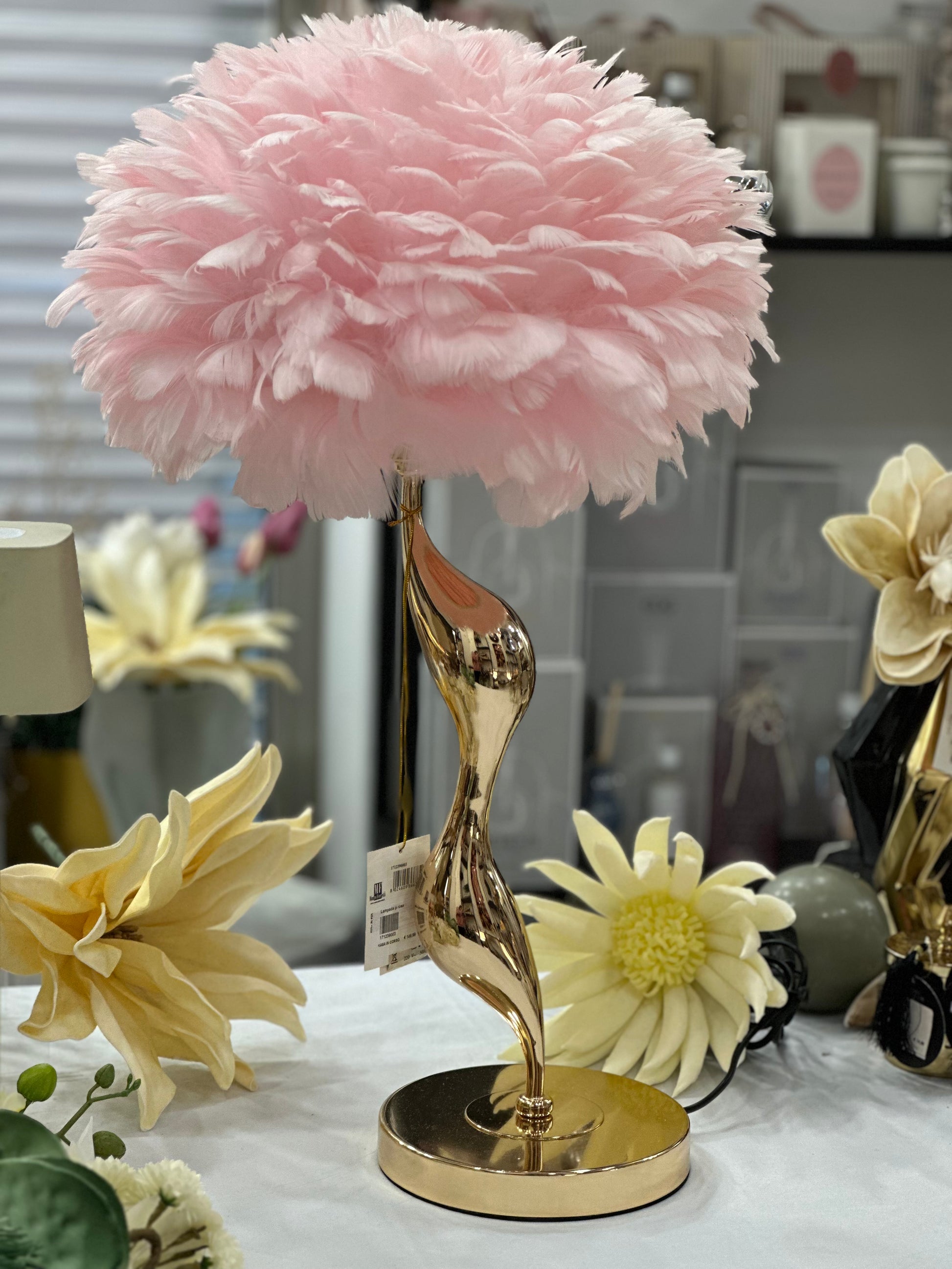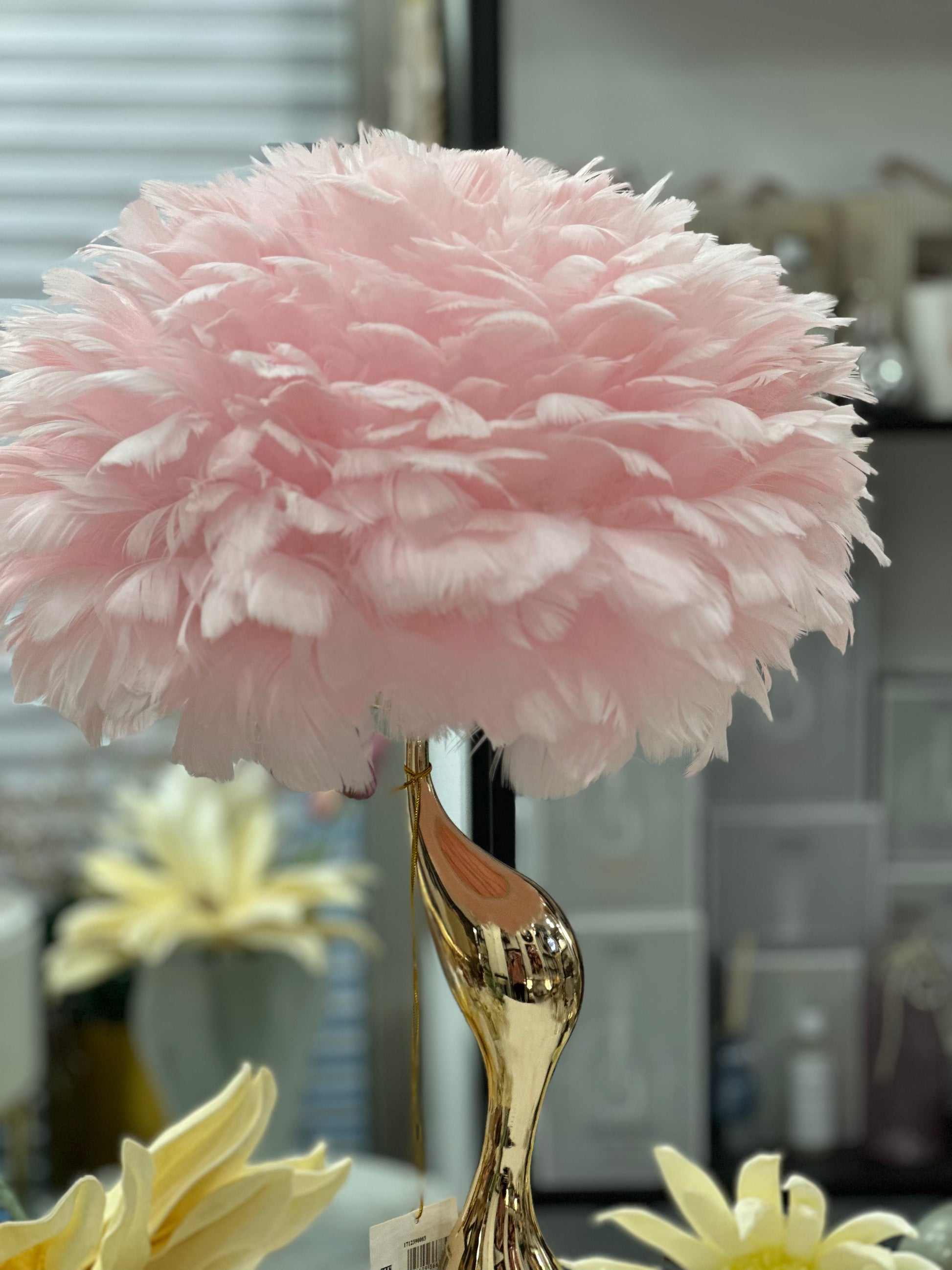 Lampada da tavolo elegante in rosa con morbide piume. Perfetta per ogni tipologia di arredamento, donerà un tocco di eleganza e design ad ogni camera.
