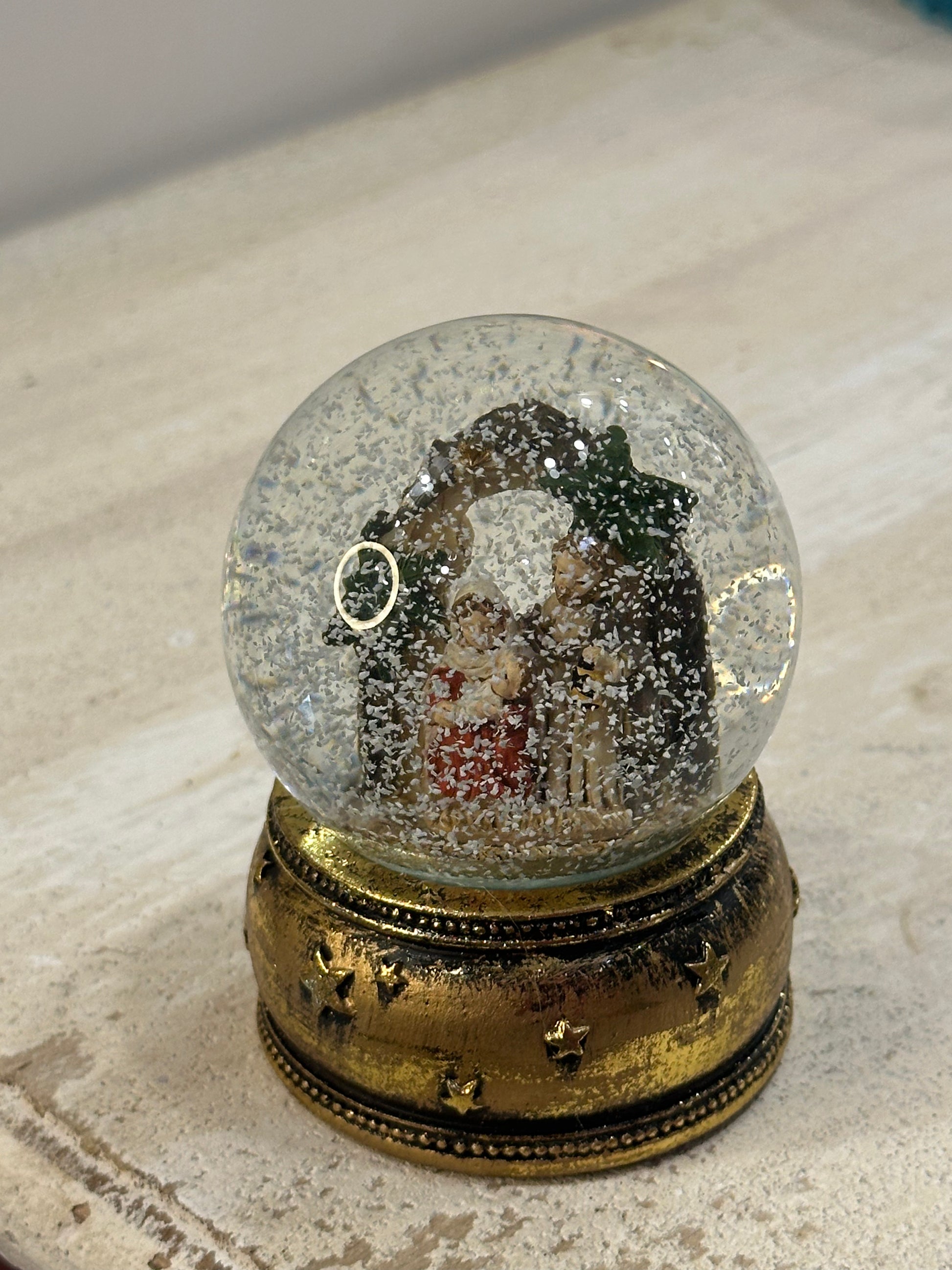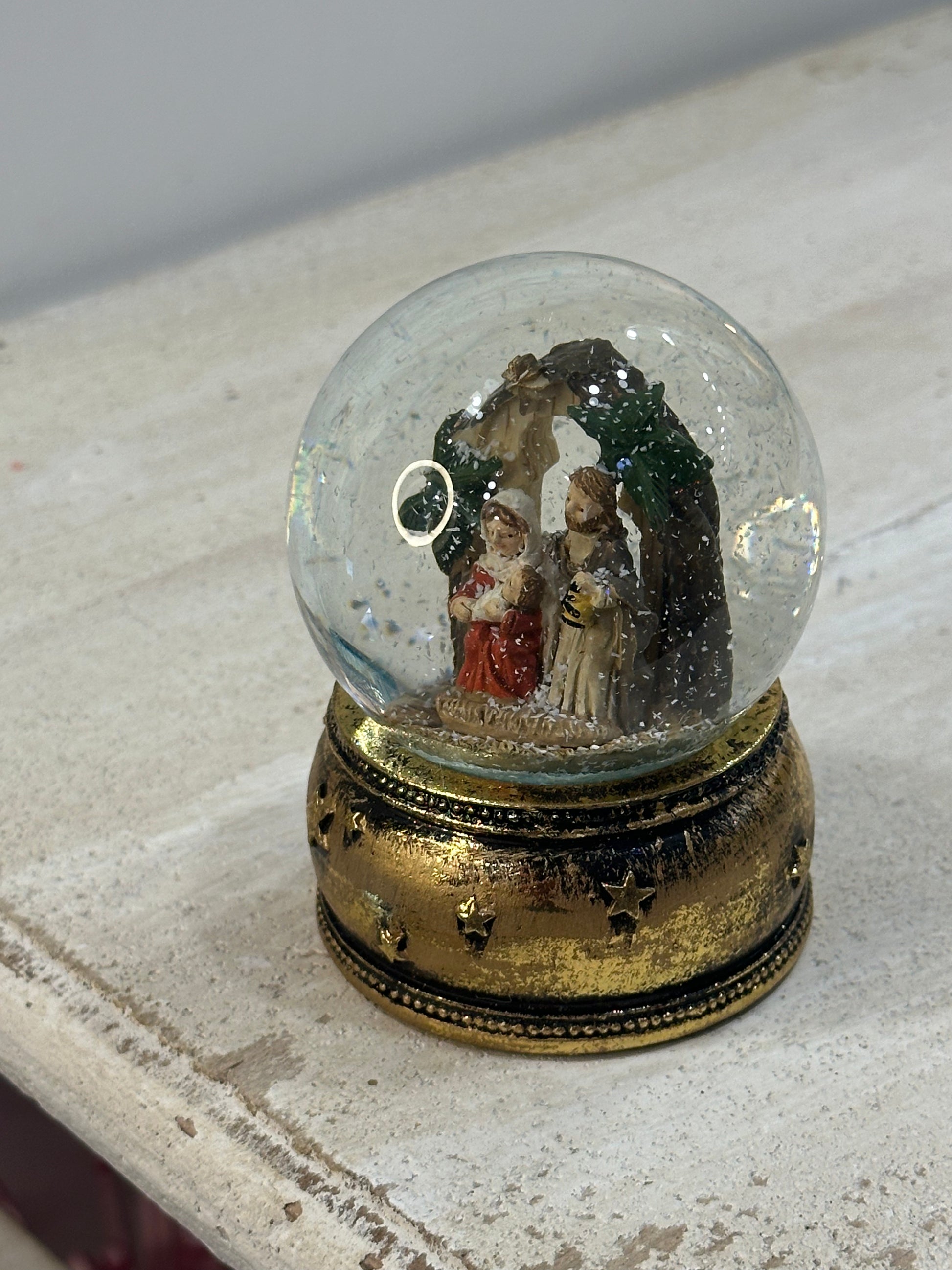 Elegante pallina innevata natalizia rappresentante la natività - Montemaggi