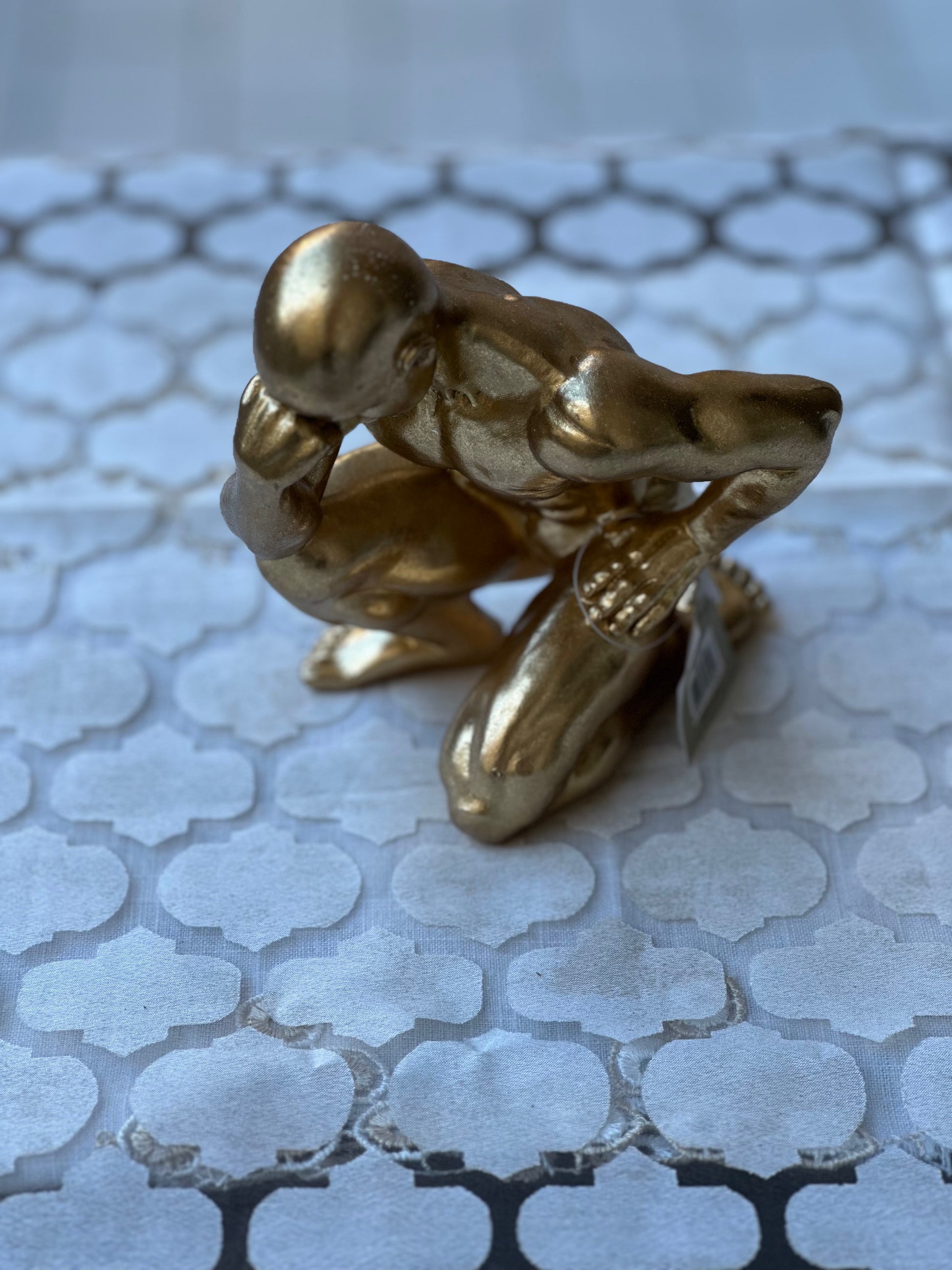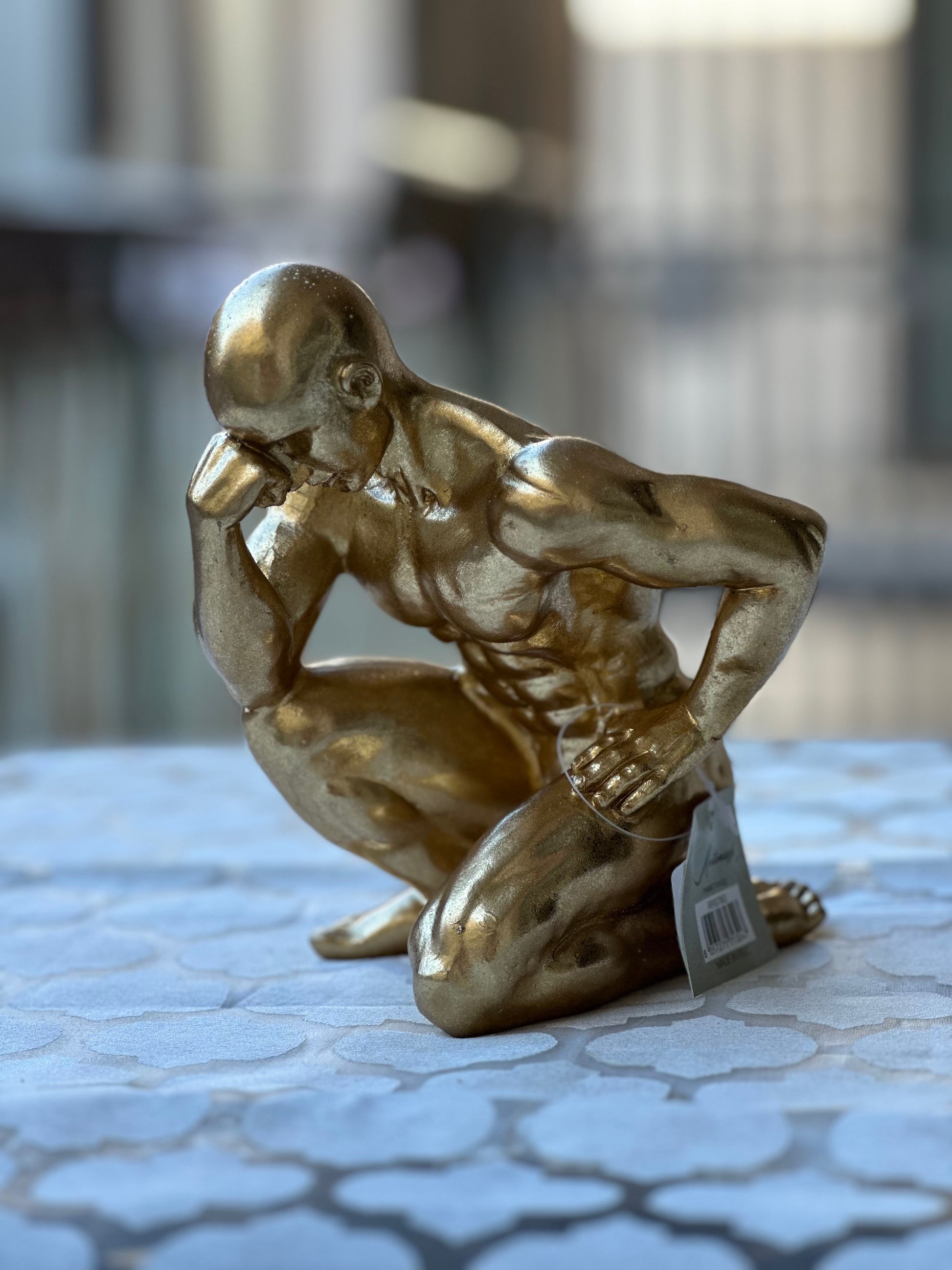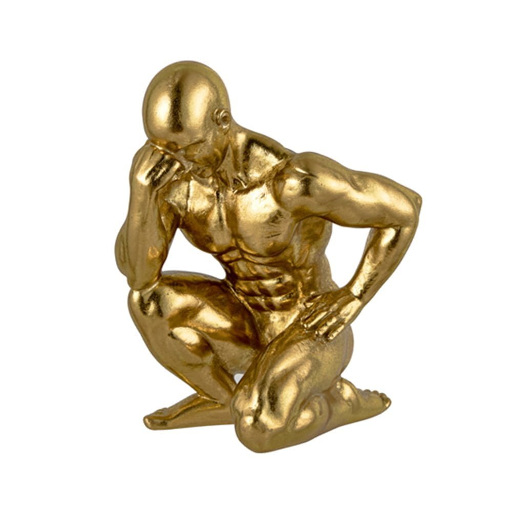Scultura raffigurante un uomo muscoloso in una posizione di meditazione inginocchiato, che trasmette un senso di ponderazione e riflessione. La finitura dorata conferisce un tocco di lusso e eleganza, rendendo questa statuetta non solo un elemento decorativo, ma anche un pezzo d’arte che attira lo sguardo.