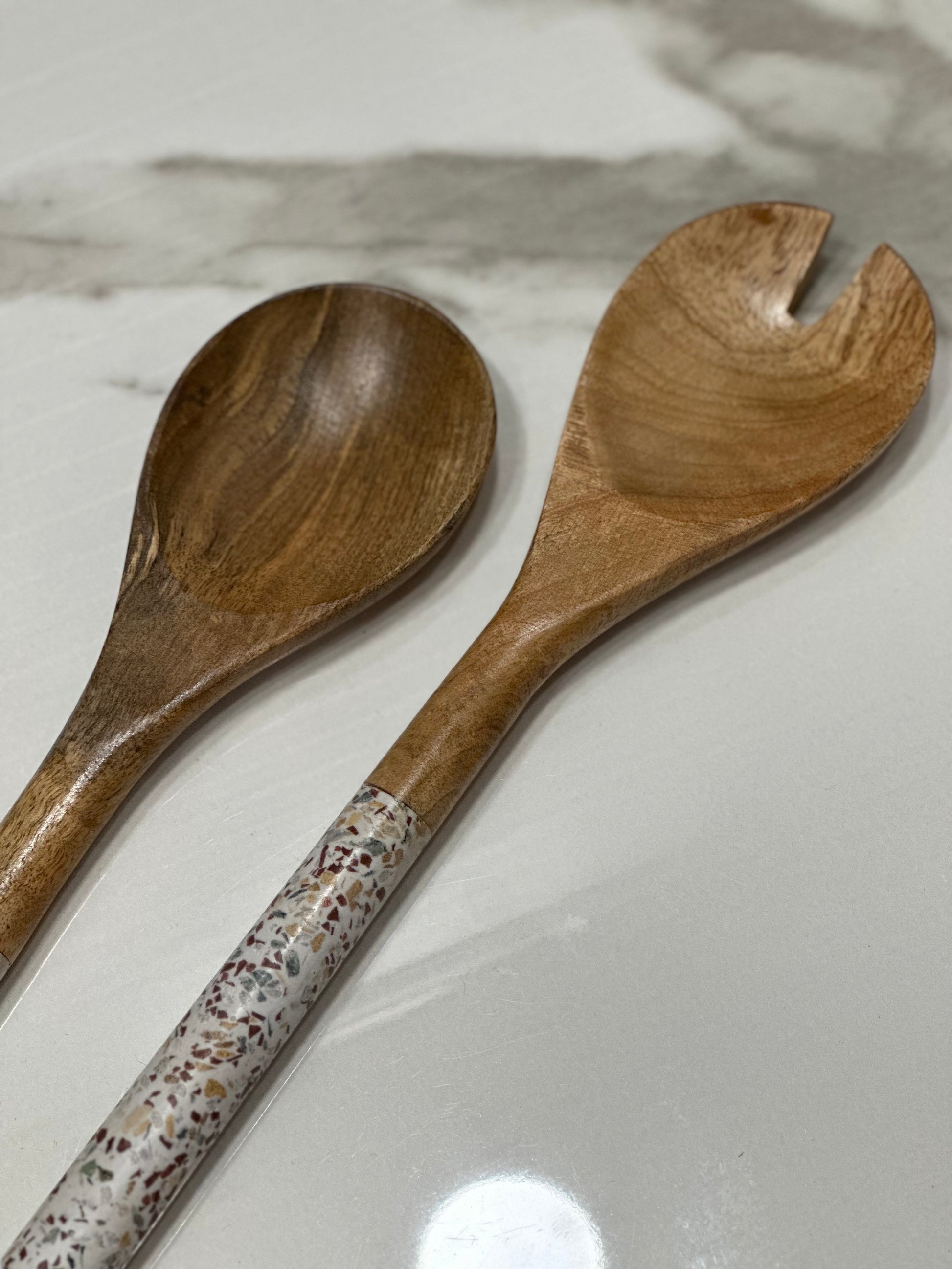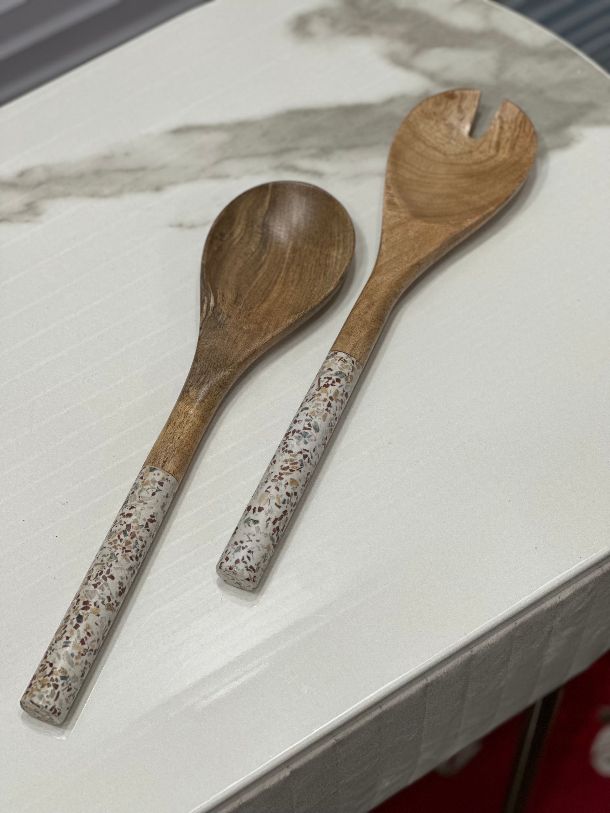 Eleganti e funzionali, queste posate per insalata in legno con manici marmorizzati aggiungono un tocco di naturalezza e raffinatezza alla tua tavola. Perfette per lanciare e servire le tue insalate con stile, uniscono resistenza ed estetica per arricchire i tuoi pasti quotidiani e i tuoi ricevimenti.