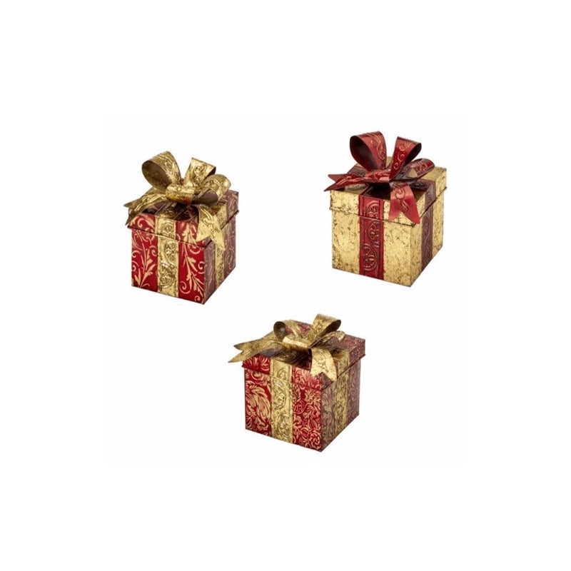 Scatola regalo decorativa in latta. La scatola è prevalentemente rossa e oro, con un motivo a volute in rilievo che le conferisce un aspetto elegante e festivo. È chiusa da un grande fiocco color oro con lo stesso motivo decorativo - PALAIS ROYAL