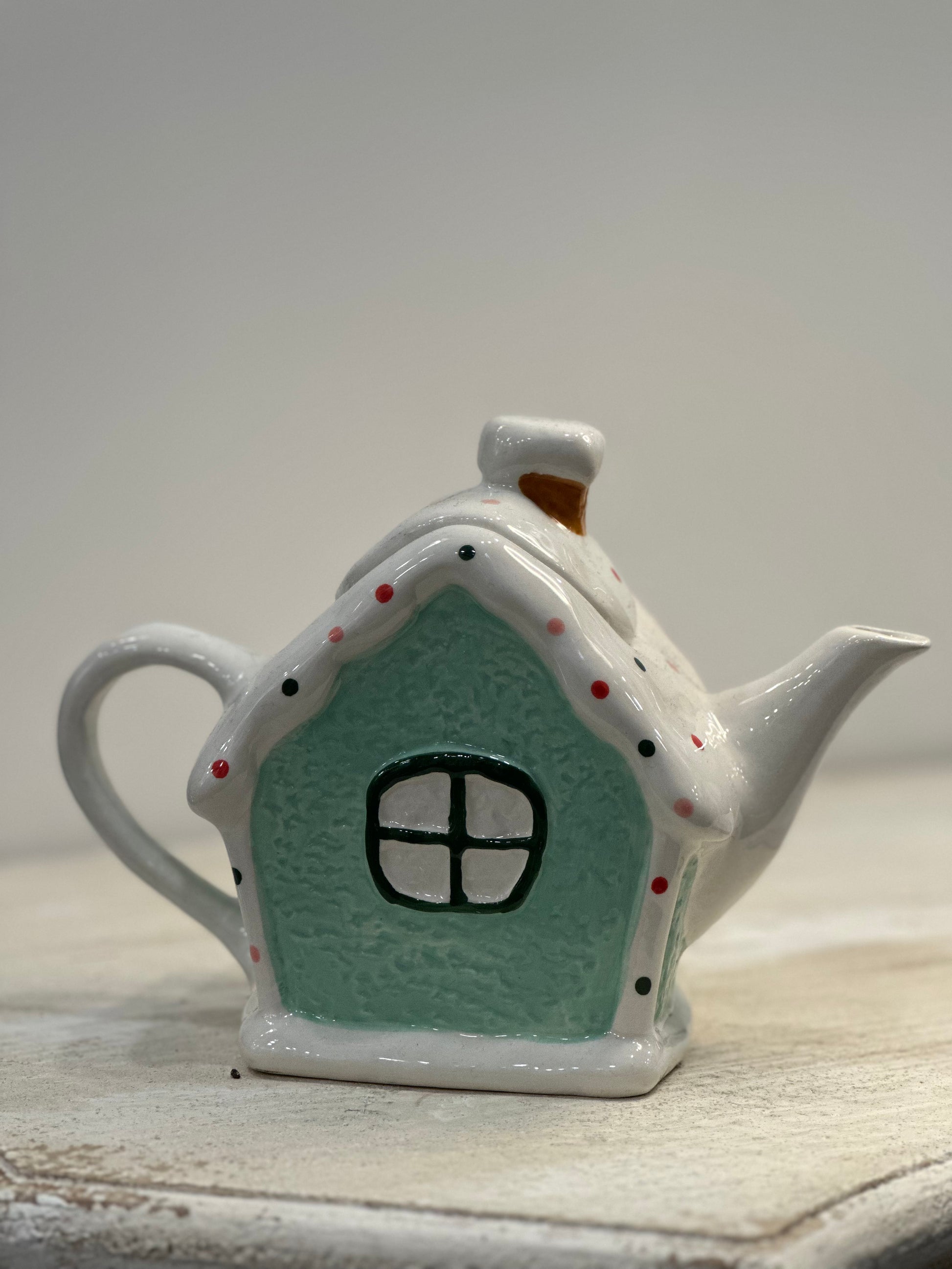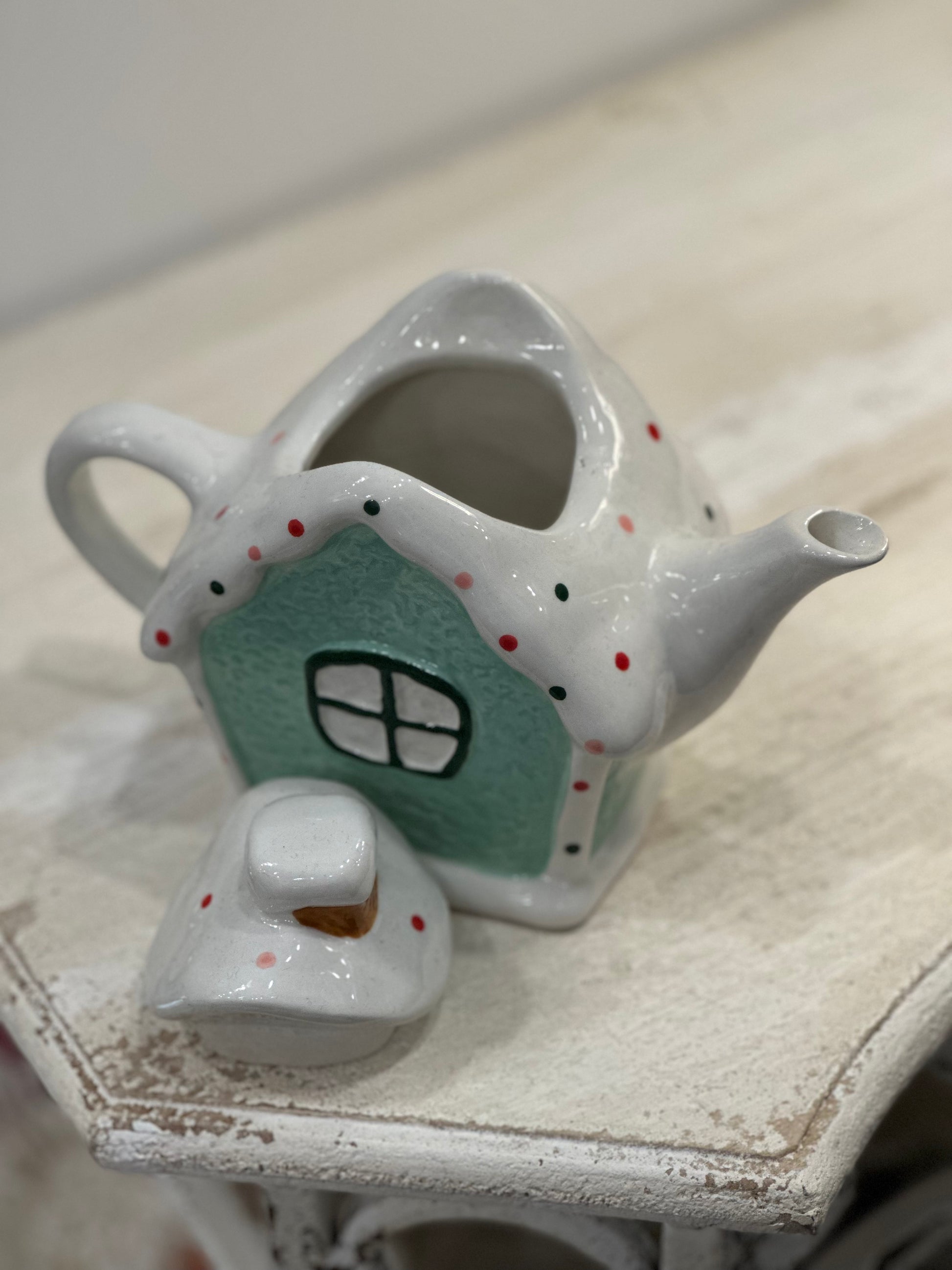 Deliziosa teiera in forma di casetta di pan di zenzero.