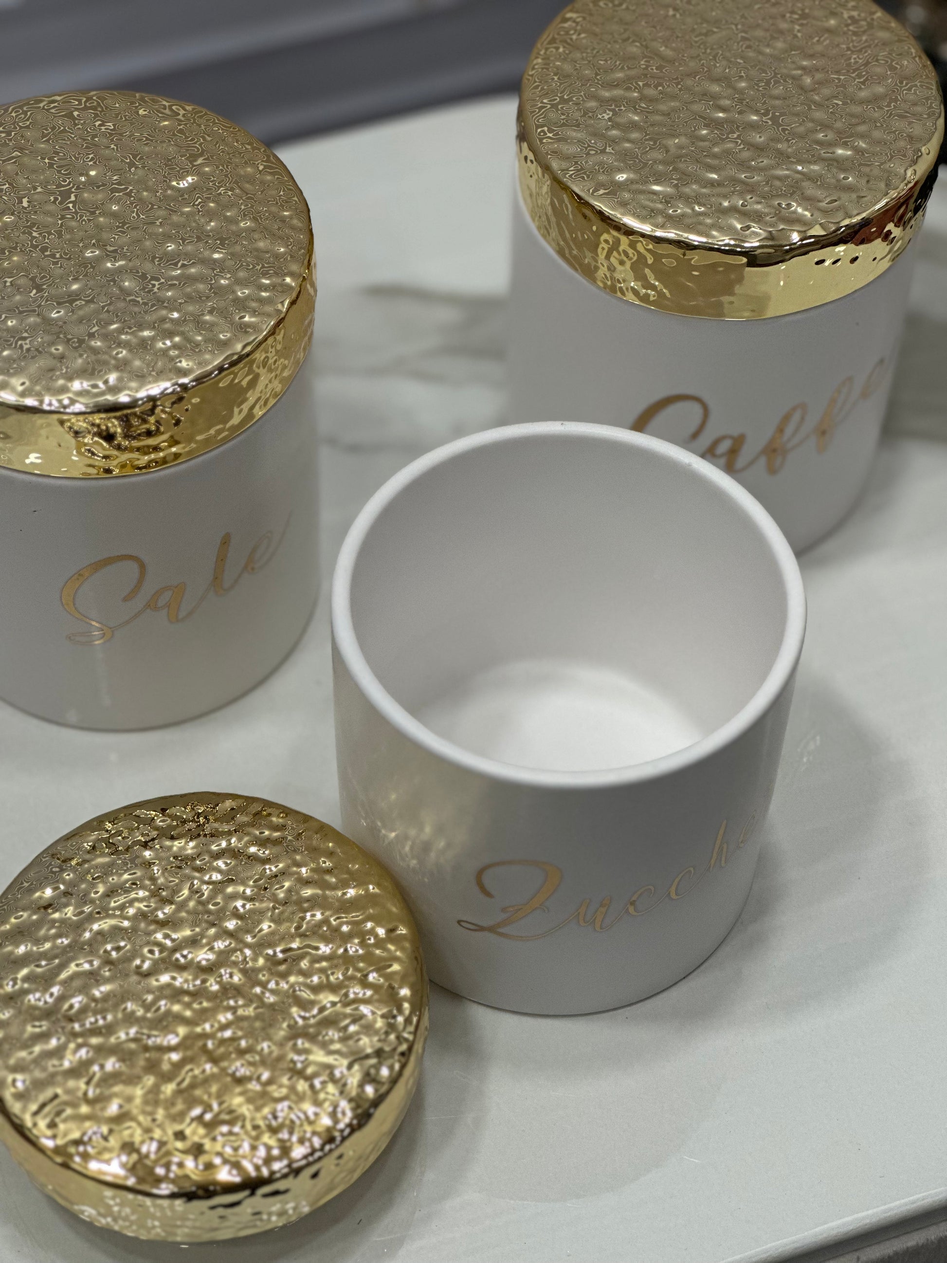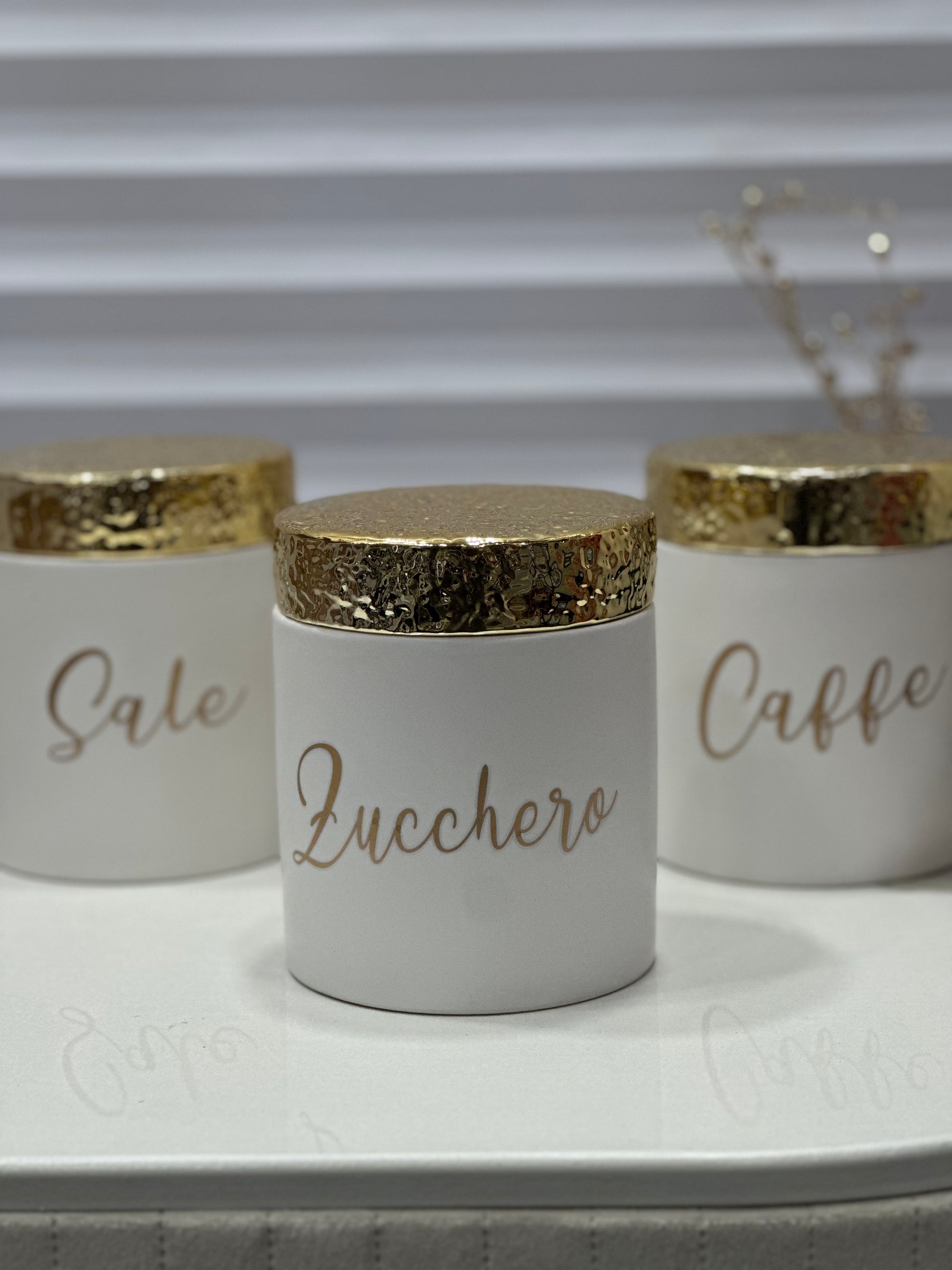 Tris barattoli sale, zucchero, caffè. Corpo in rifinitura satinata, parte superiore in oro martellato.