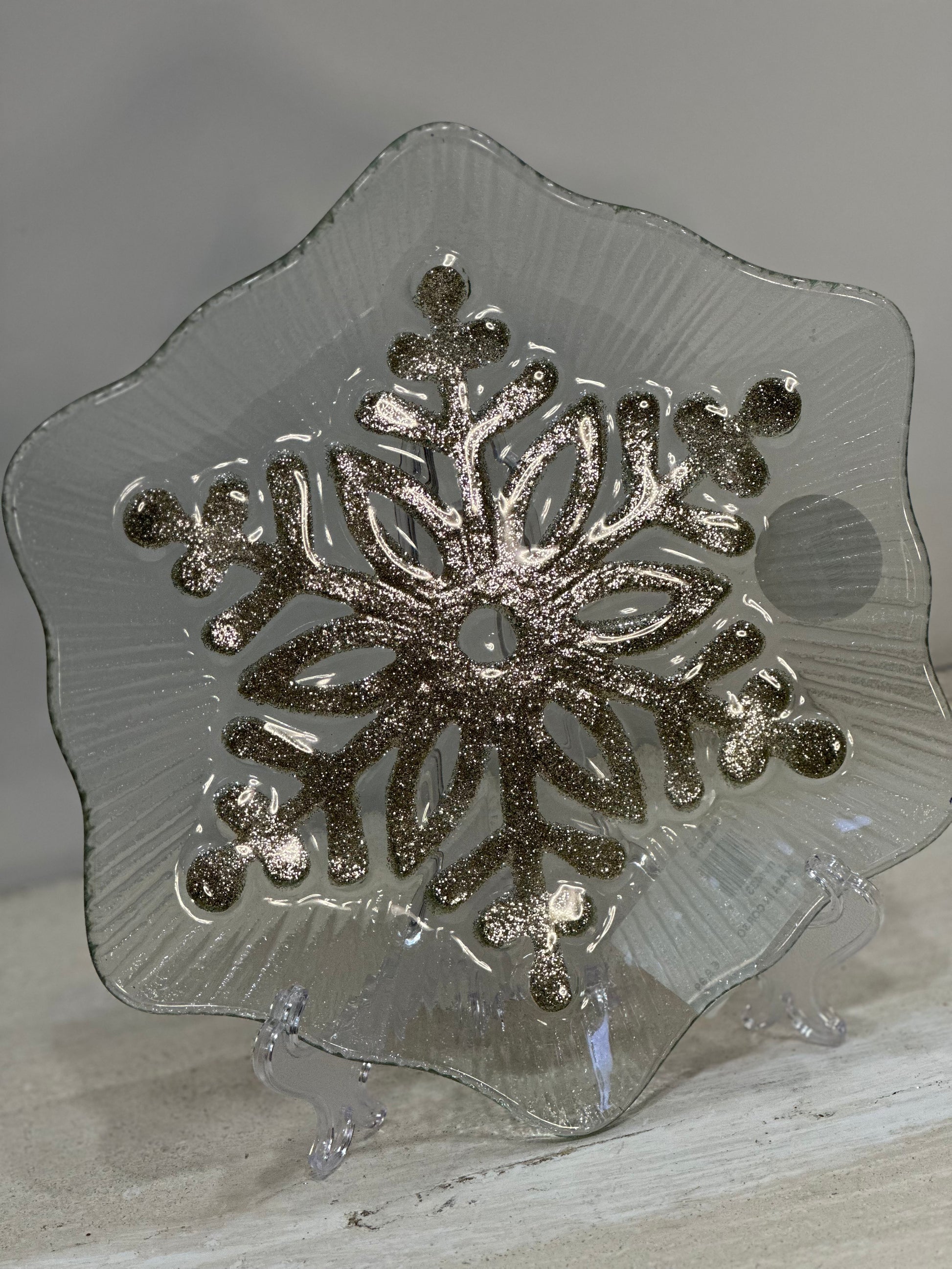 Elegante vassoio natalizio in vetro raffigurante un fiocco di neve.