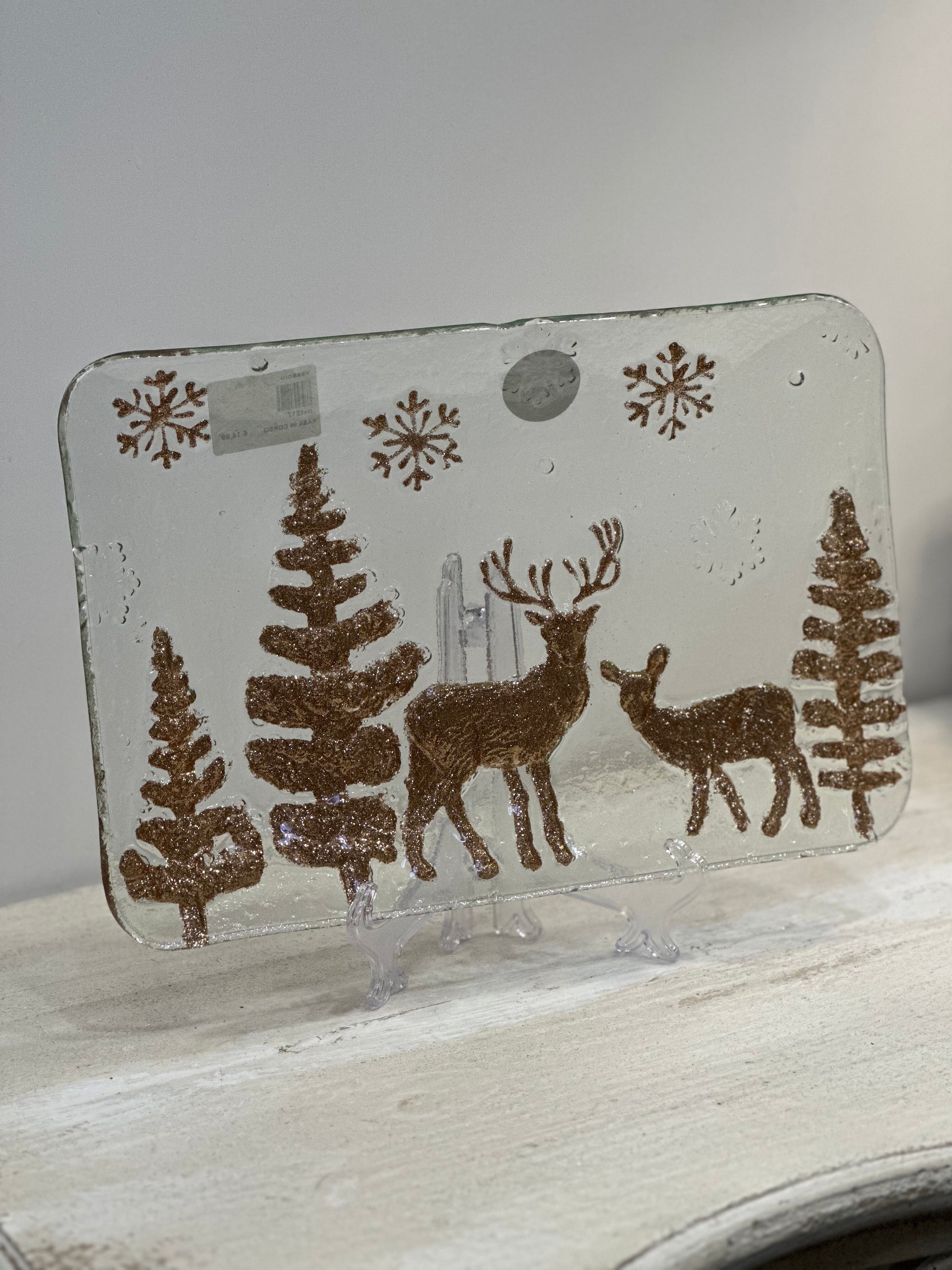 Elegante vassoio natalizio in vetro raffigurante renne.